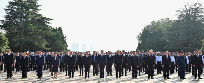 廣場上,省委,省人大常委會,省政府,省政協,省軍區,省各民主黨派、工商聯、無黨派愛國人士,各人民團體和各界代表,老戰士、老同志和烈士親屬代表,少年先鋒隊分別敬獻的9個花籃一字排開。花籃紅色緞帶上書寫的“烈士永垂不朽”大字,在陽光下熠熠生輝。伴隨著低沉深情的《獻花曲》,18名禮兵抬起花籃,緩步走向烈士紀念碑,依次將花籃整齊擺放在紀念碑基座上。梁言順、王清憲、唐良智、劉國賓、陶明倫神情莊重、邁步上前,仔細整理緞帶,向紀念碑行注目禮。接著,省黨政軍領導依次上前,繞行瞻仰烈士紀念碑。現場各界代表有序行至紀念碑前敬獻鮮花,表達對英烈的深切懷念。
